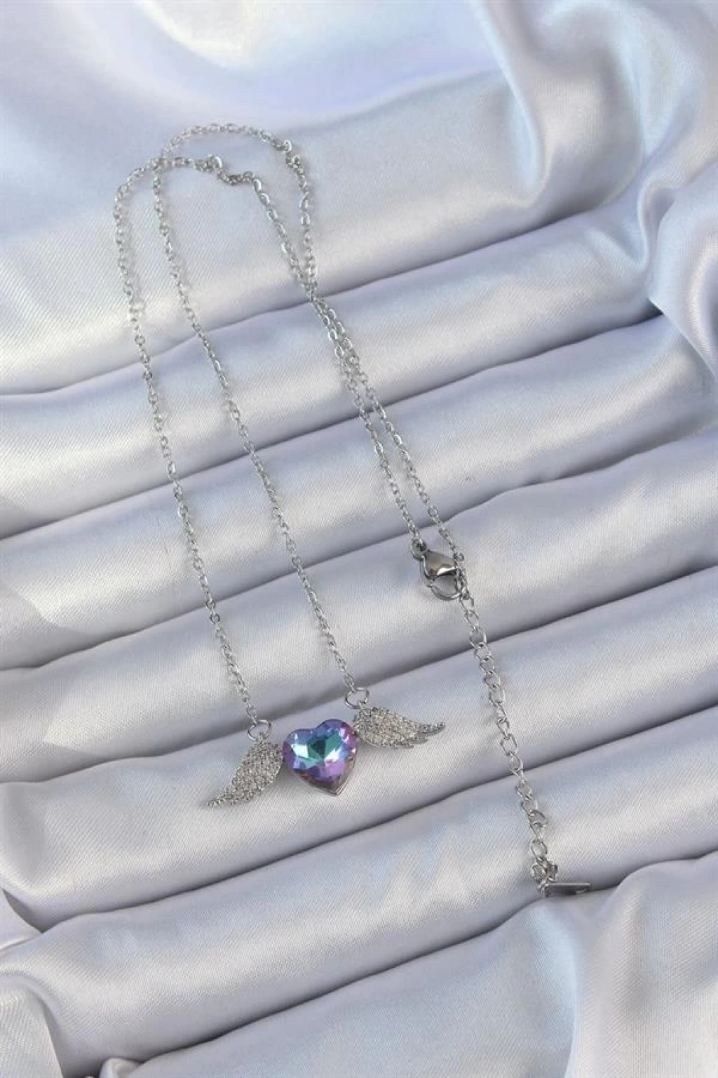 316L Çelik Zincir Gümüş Renk Mavi Mor Zirkon Taşlı Kanatlı Kalp Kolye
