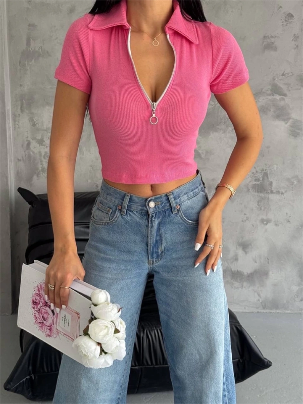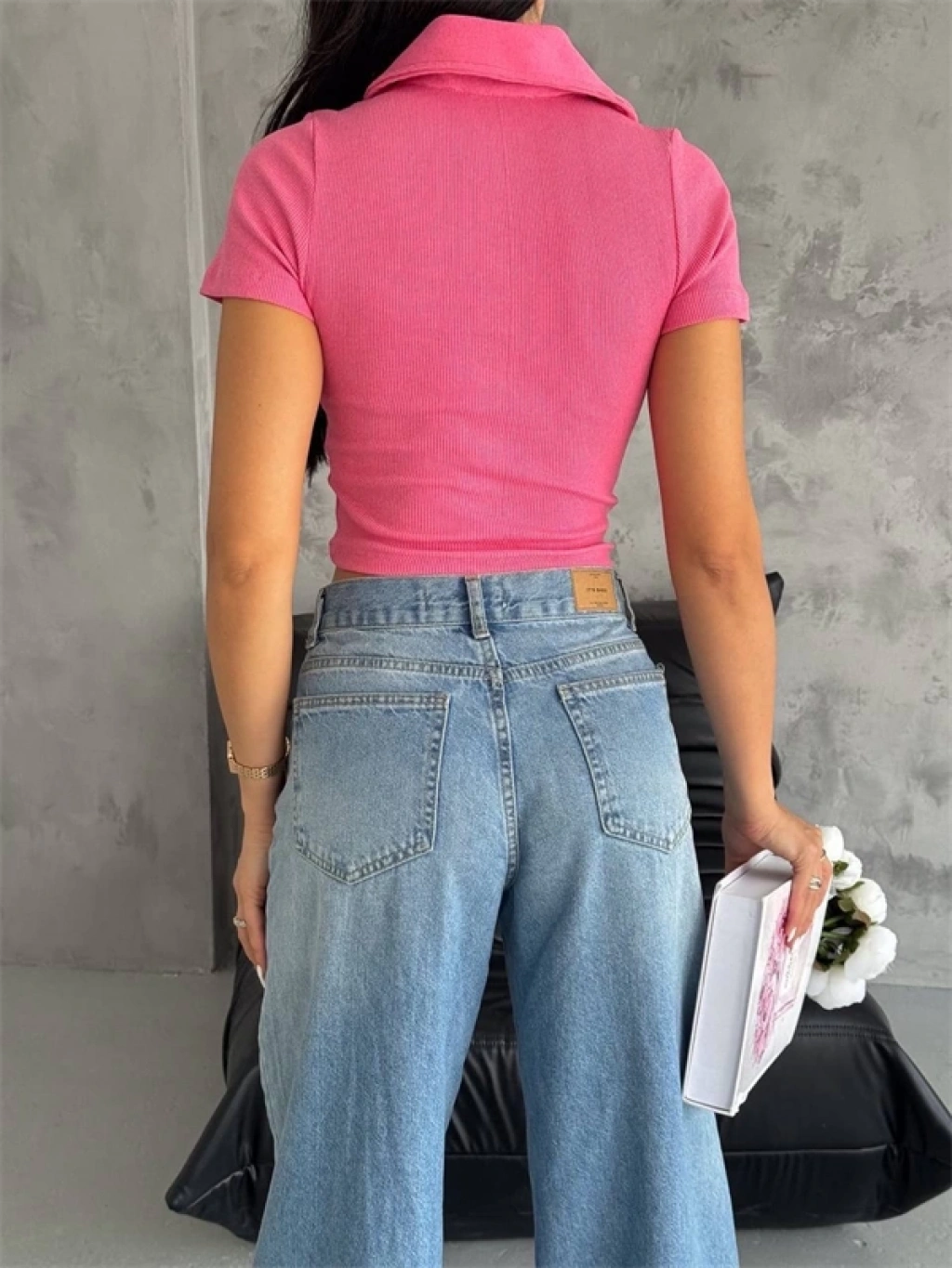 Kaşkorse Yaka Fermuarlı Bluz Fuşya