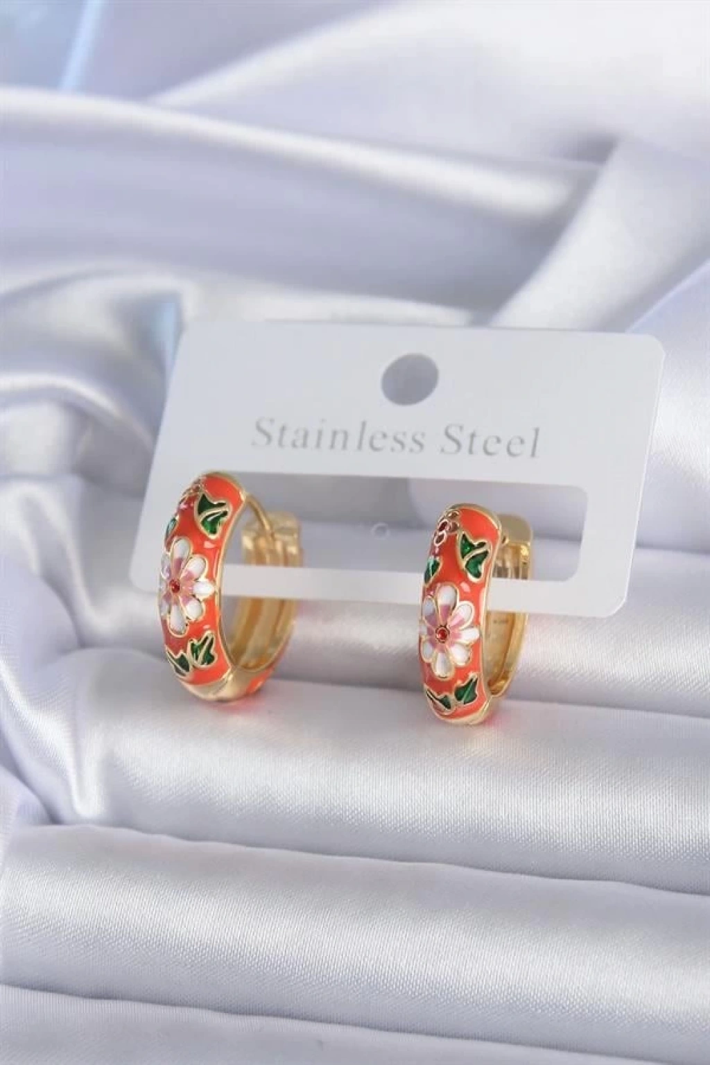 Pirinç Gold Renk Çiçek İşleme Turuncu Kadın Küpe